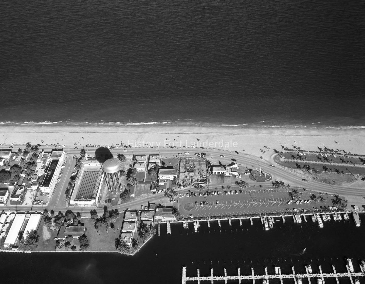 Aerial view of A1A, the beach, Intracoastal & SE 4 St (Illini). Casino Pool is pictured left of the water tower. Partial of Bahia Mar marina.