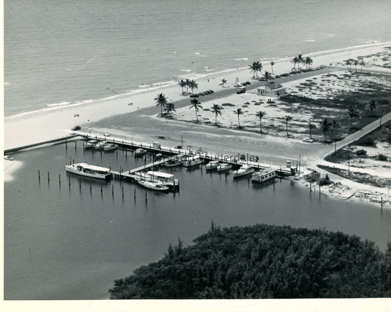 A view of Danina beach and boat dock. Automobiles parked along the beach and swimmers bathing in the beach.Collection