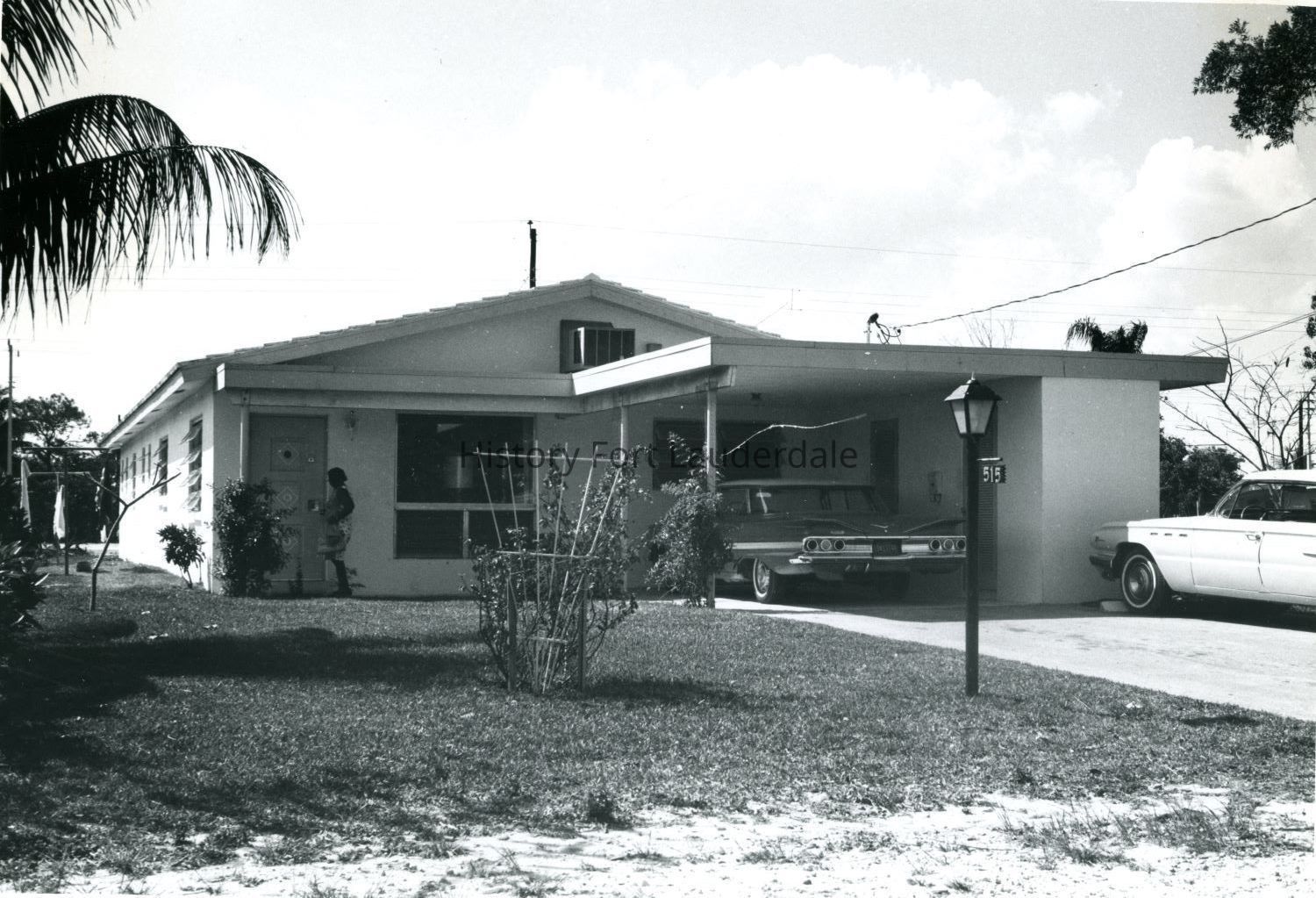 Nathan Lewis Residence (515 NW 6th Avenue) - One story concrete residence with carport; two cars parked in front. African-American woman standing near the front door.Collection
