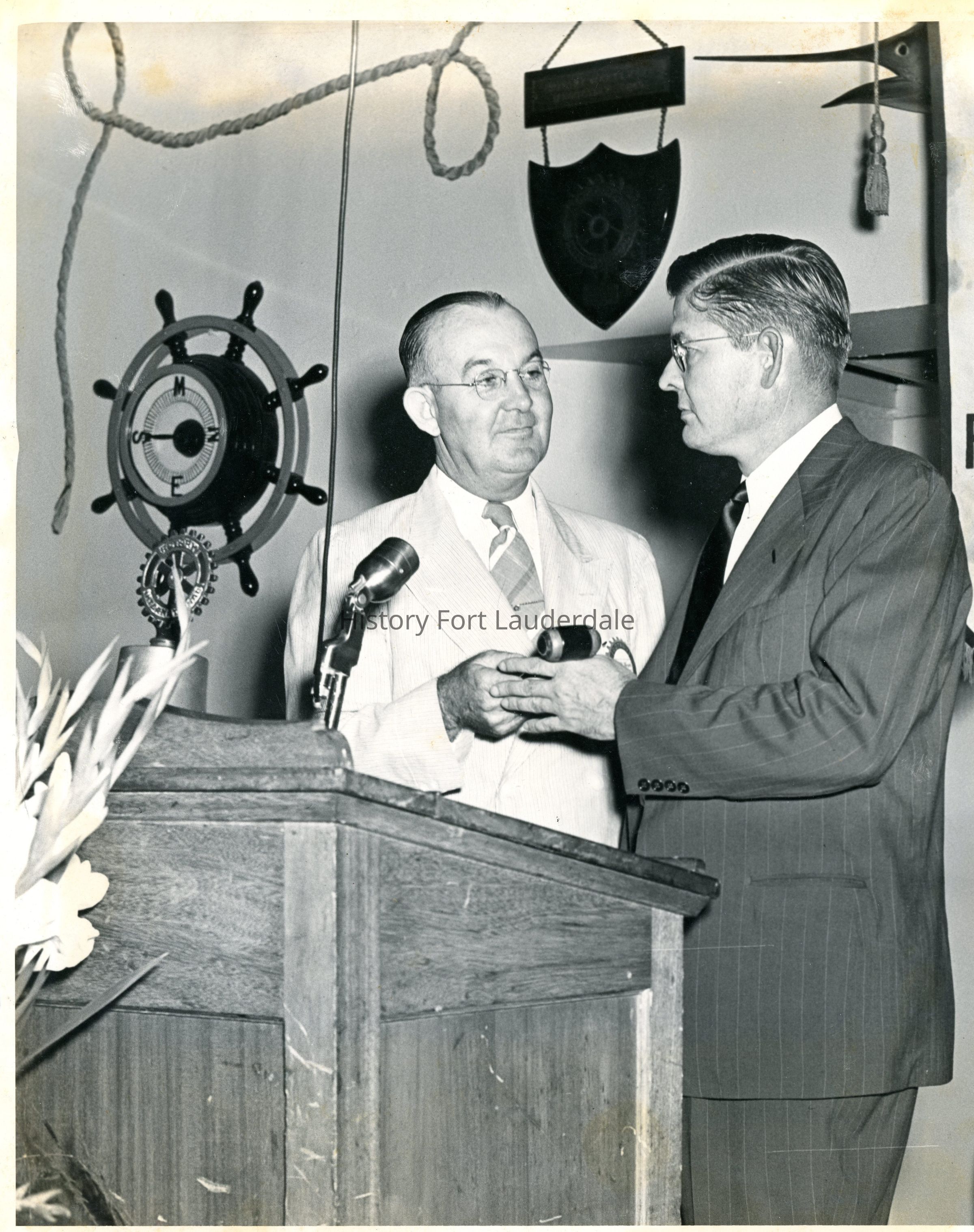 New member, J.B.(Pat) Patterson, local attorney shown receiving the gavel of authority from retiring President Paul Meyers.Collection