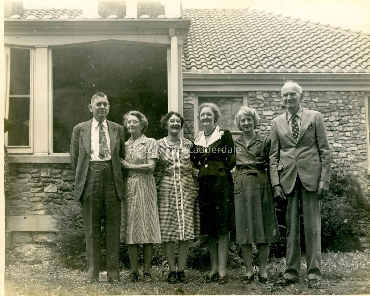 Six unknown people in a line in front of a house. Four women in the center and two men at each end. Taken in May of 1946 at family reunion, possibly at Tocca's Goodletville.Collection