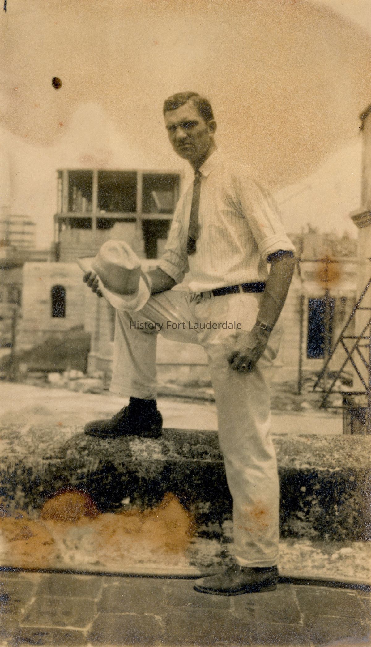Martin Burghard standing on a stone walkway with his right leg up on a curb. Holding a cowboy hat in his right hand. Dressed in a shirt and tie. Building construction in the background.Collection