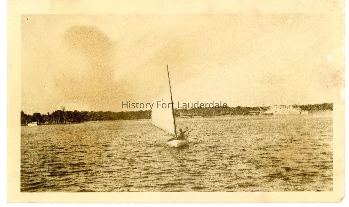 Two people sailing on the Lady Luck across an unidentified body of water with a sea plane flying behind them. There is a dense tree line along the beach, and a large white building situated on coast.Collection