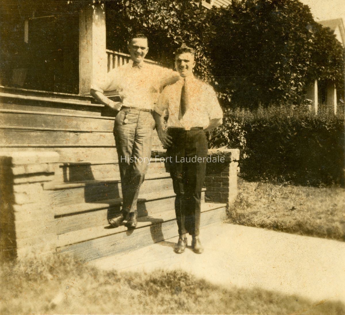 August Burghard standing on the bottom step of a wooden front porch of an unidentified house. He is leaning on his brother, Martin, who is standing on the ground. There yard is filled with many shrubs and bushes. There are brick cornerstones on either side of the wooden stairs.Collection