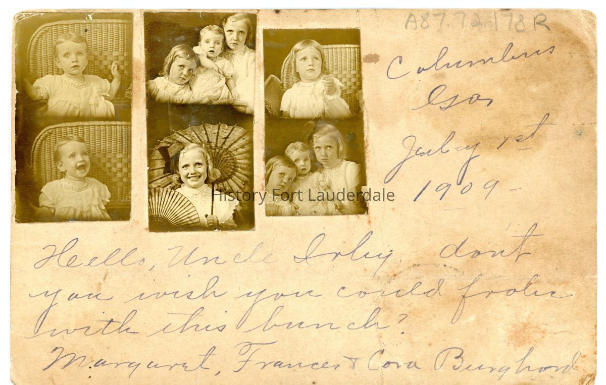 A postcard sent to Mr. Irby and Charlotte Meadows, Opelika, Alabama on July 1st, 1909 from an unidentified woman in Columbus, Georgia. There are photos of Margaret, Frances, and Cora Burghard, along with a caption, "Hello, Uncle Irby, don't you wish you could frolic with this bunch?" Signed: Margaret, Frances + Cora BurghardCollection