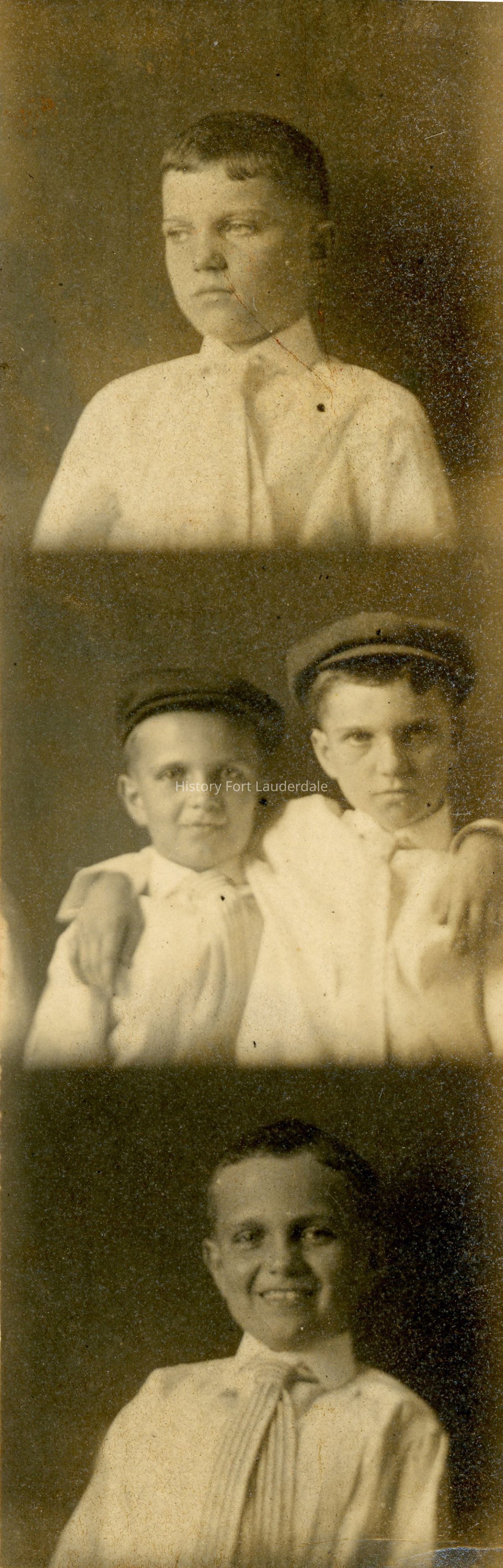 A photo strip of three photos. Top: Martin Burghard, Middle: Martin and August Burghard wearing newsboy hats, Bottom: August Burghard.Collection