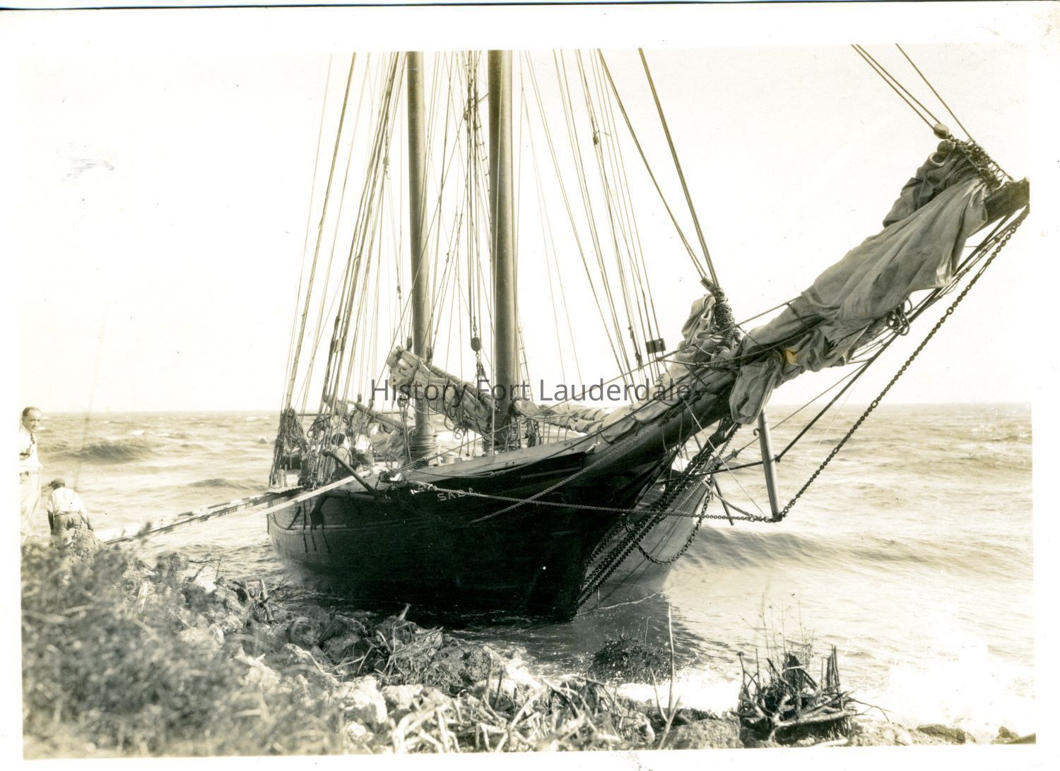 Schooner yacht (sailboat) docked along the oceanfront. Man with tie standing to the far left. African-American men onboard and one at the base of the wooden entry/exit plank.Collection