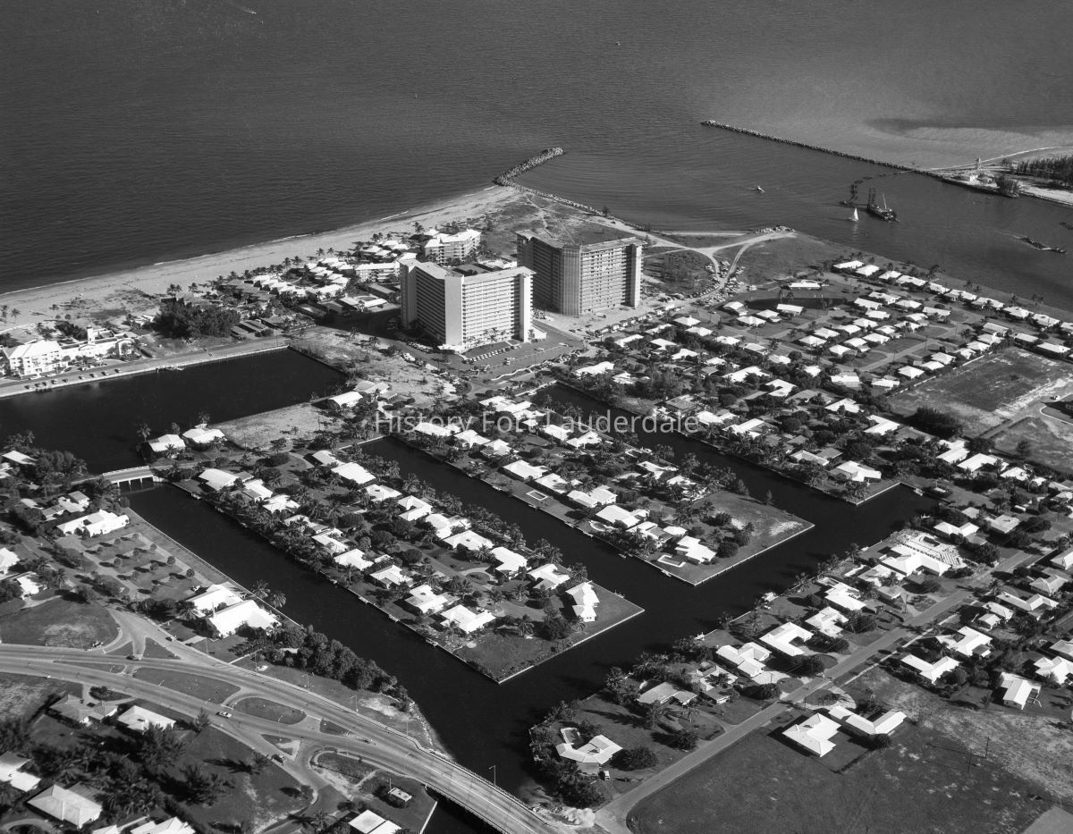 Aerial view of Breakwater Development located south of SE 17 St and Lake Sylvia. Entrance to Port Everglades at upper right of photograph.