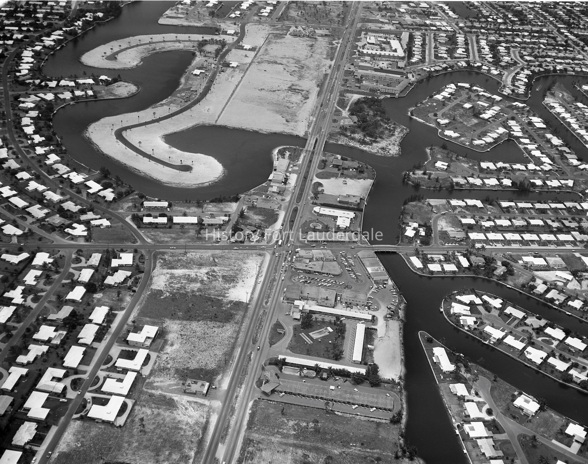 This image shows the intersection of NE 26th Street and N Federal Highway, looking south. The Middle River is in the upper left quadrant of the image and the North and South Forks of the Middle River surrounding the Middle River Isles of Wilton Manors are shown to the right. The cleared space in the upper left quadrant of the image is the site of Union Planters Plaza. L1155b shows a close-up of the same area, looking north.Collection