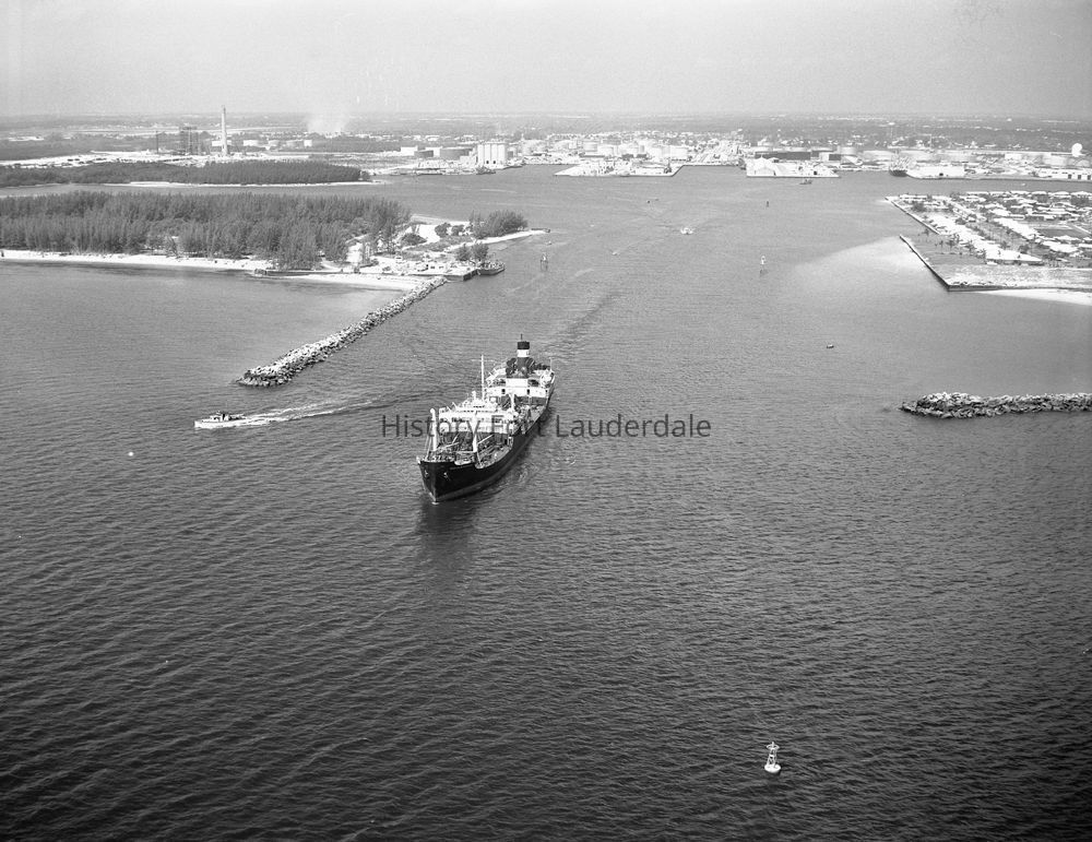Looking due west, this image shows the inlet with a chemical tanker leaving the port. Harbor Beach is shown to the right and what is today John U. Lloyd State Park is shown to the left. L1161a shows the tanker side view and close-up looking north.Collection