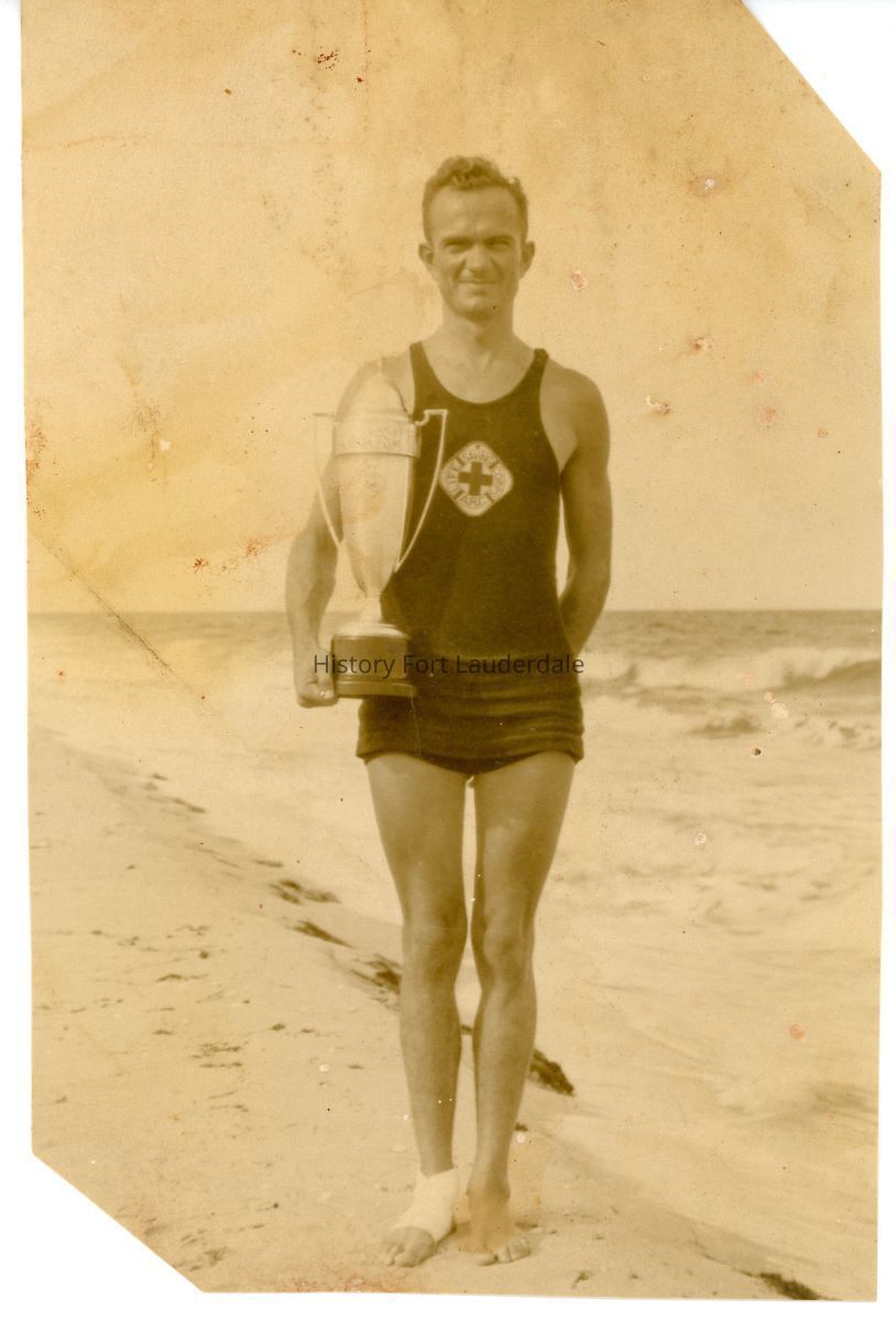 August Burghard at the beach with a swimming trophy dressed in his lifeguard uniform. His right foot is bandaged. The handwritten inscription on the back of the photograph is cut off, but what remains reads, "[H]ugs to Lo[...] [F]rom her Uncle Aug[...]."Collection