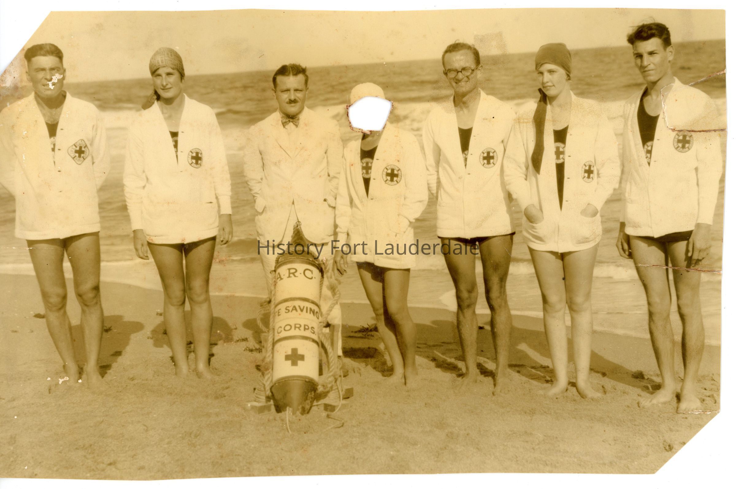 August (glasses) with fellow lifeguards in front of the ocean at Fort Lauderdale beach. The woman in the centre of the photograph has had her face cut out of the picture. There is a A.R.C. Life Saving Corps. buoy placed in the sand.Collection
