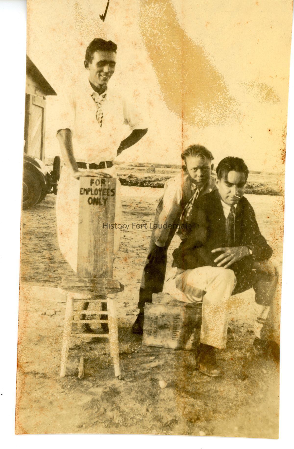 Bob, Merle Fogg, and a young boy. Merle is sitting on a Gargoyle Mobiloil Vacuum Oil Company can. Bob is leaning on a chair, which reads "For employees only" which he manufactured. The back of the photo reads "Bob - Merle + the kid, Bob manufactured the chair."Collection