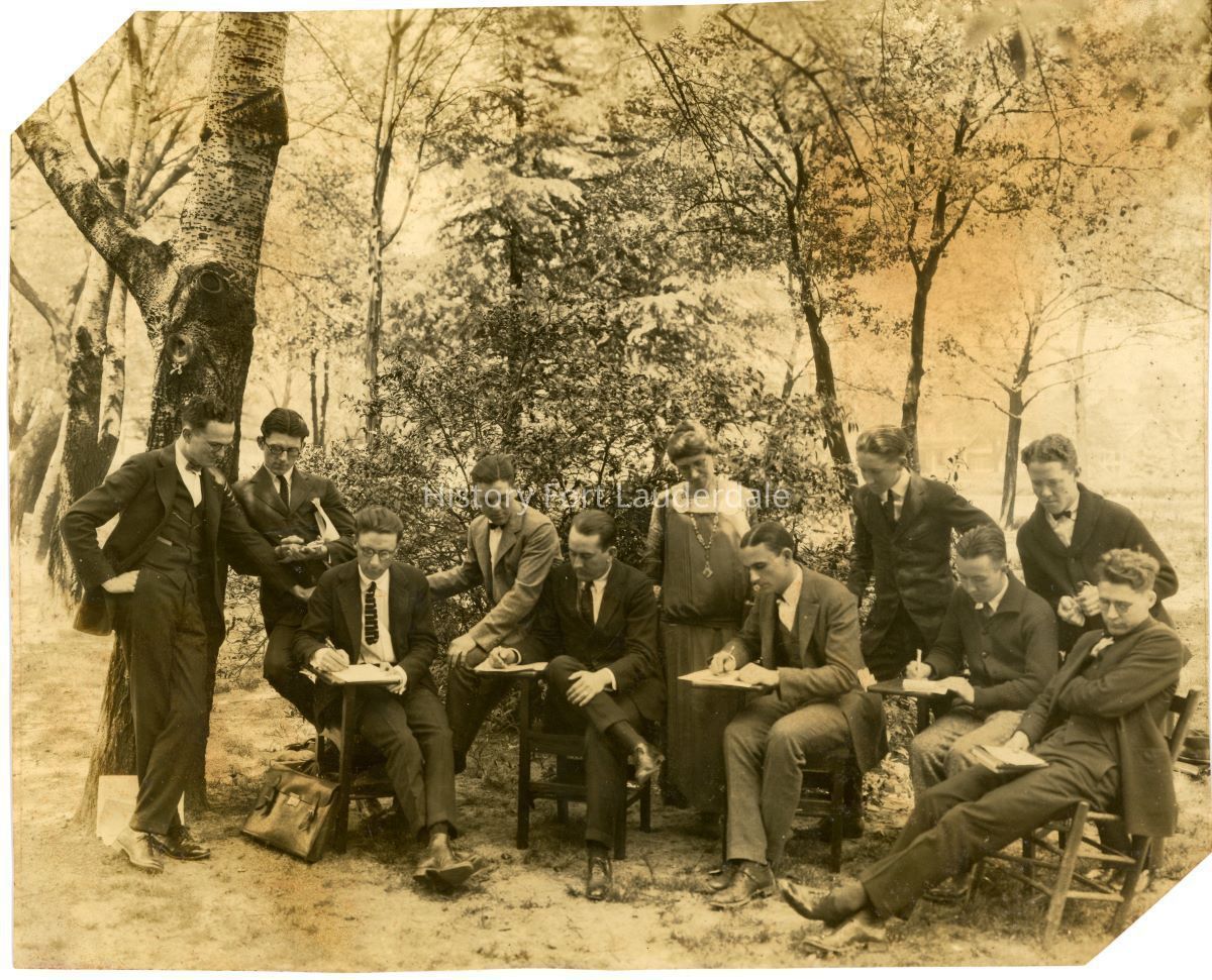 A group of young men, and one woman studying outside, possibly at Mercer University in Macon, Georgia. August Jr. on the far left in front of a tree.Collection