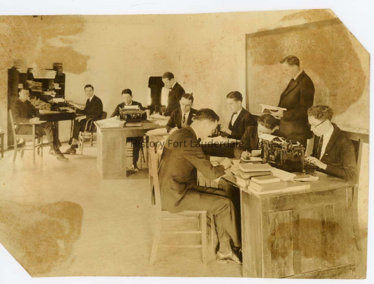 A group of men studying in a classroom, possibly at Mercer University. August Jr. is sitting on the left side of the table in the foreground.Collection