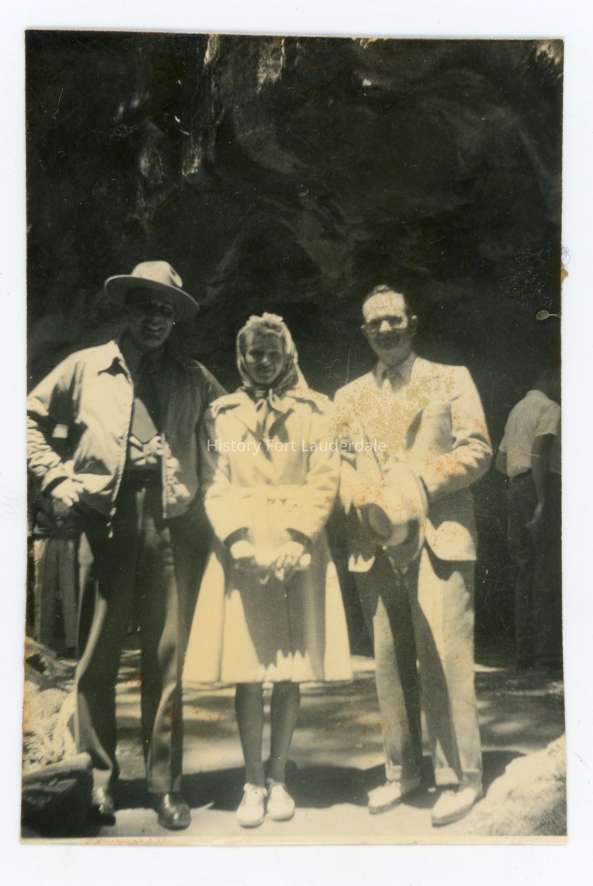 August Jr. on right with his daugter Patricia and a Ranger from Sequoia National Park in front of the entrance to the caves. The back reads, "This is prior to going into the caves at Sequoia Nat'l Park. Ranger Anderson on the left. Patsy, have you thawed out yet? 6/47."Collection