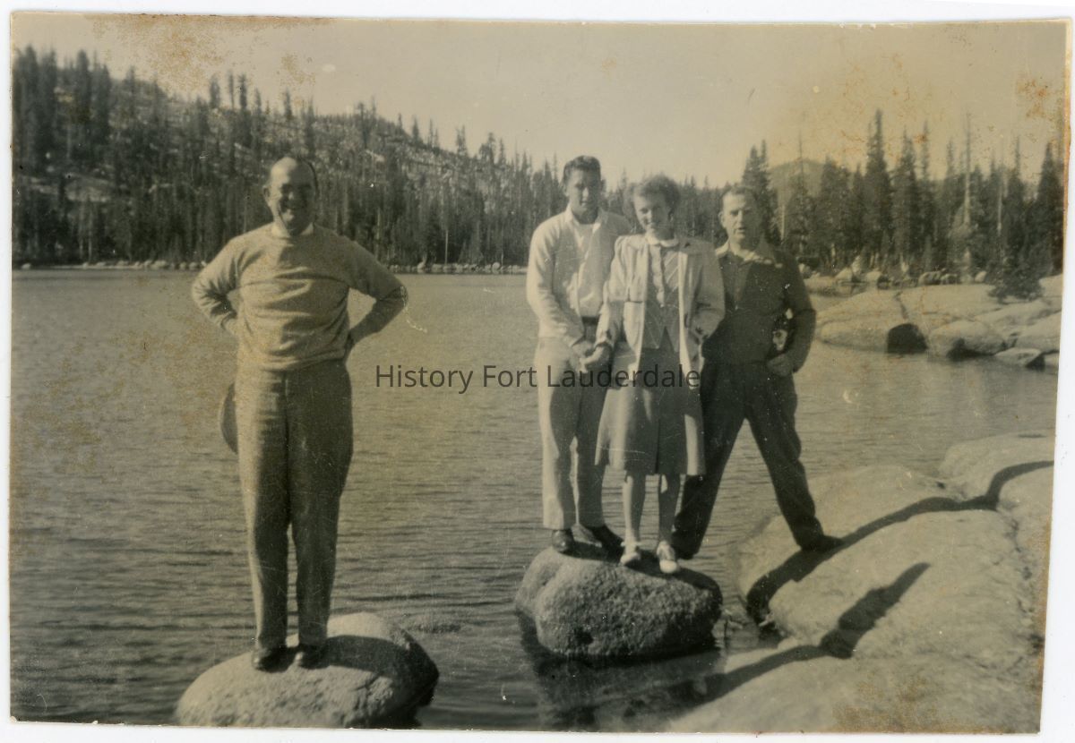August Jr. at Sequoia National Park with one of his daughters holding hands with a young man. There is another older man, approximately the same age as August. They are all standing on rocks on the edge of a river.Collection