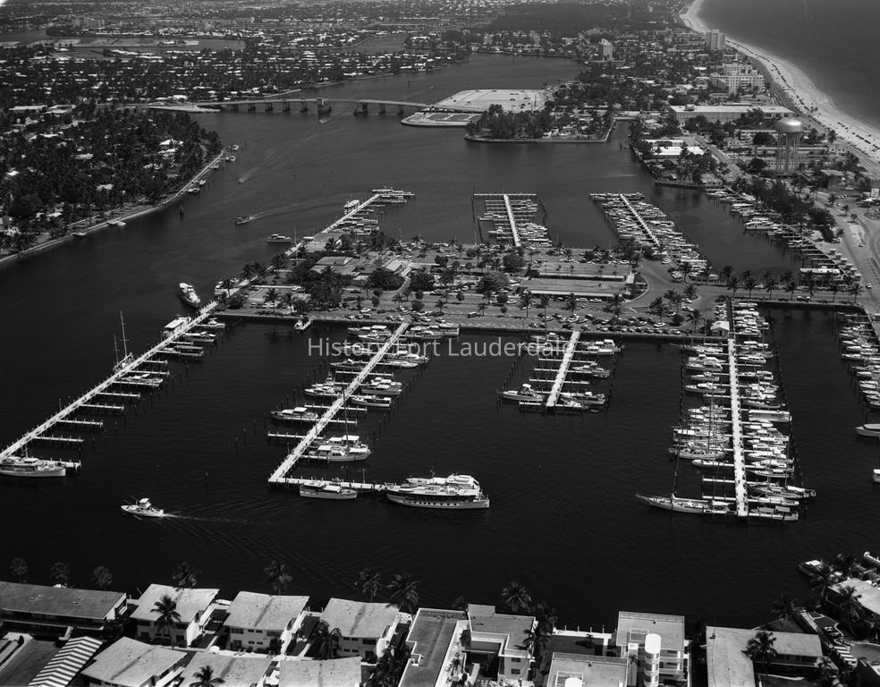 A close-up view of Bahia Mar looking N.. Las Olas Blvd. bridge (Dwight Rogers, Sr.) is shown upper center left. Harbor Drive is in the lower portion of the image. Idlewyld and the Seven Isles are shown in the upper left quadrant of the image.Collection