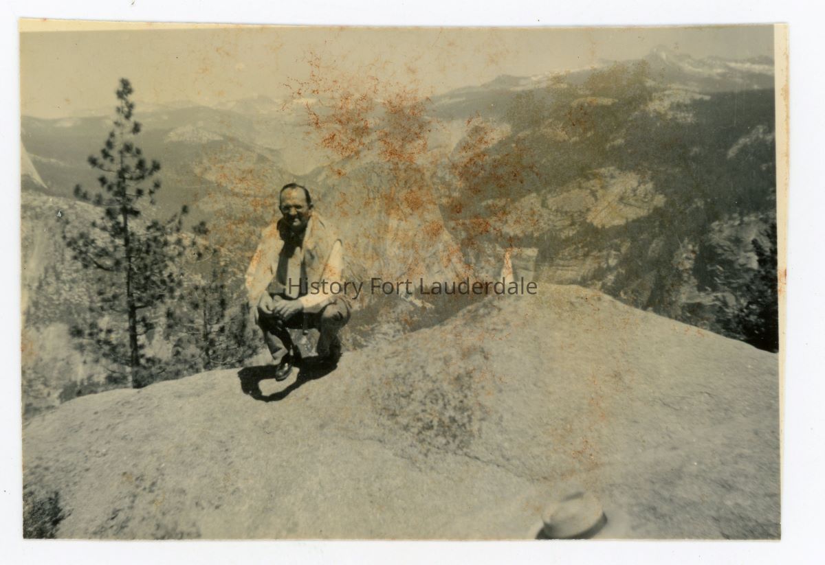 August Jr. on a cliff in Yosemite National Park overlooking the Ritter Mountain Range. August's hat is in the foreground of the photograph. The back reads, "(...) realize what a cliff is behind him. Note the snow on the Ritter Mtn Range. 6/47."Collection