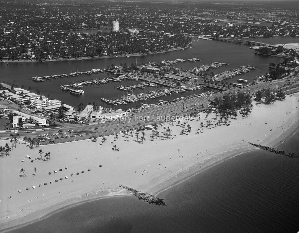 Bahia mar is at the center of this photograph. The rock jetties for the original (dredged) inlet are shown in the foreground; the inlet closed up over time after the Port Everglades Inlet was dredged. Idlewyld and the Las Olas Isles are in the background.Collection