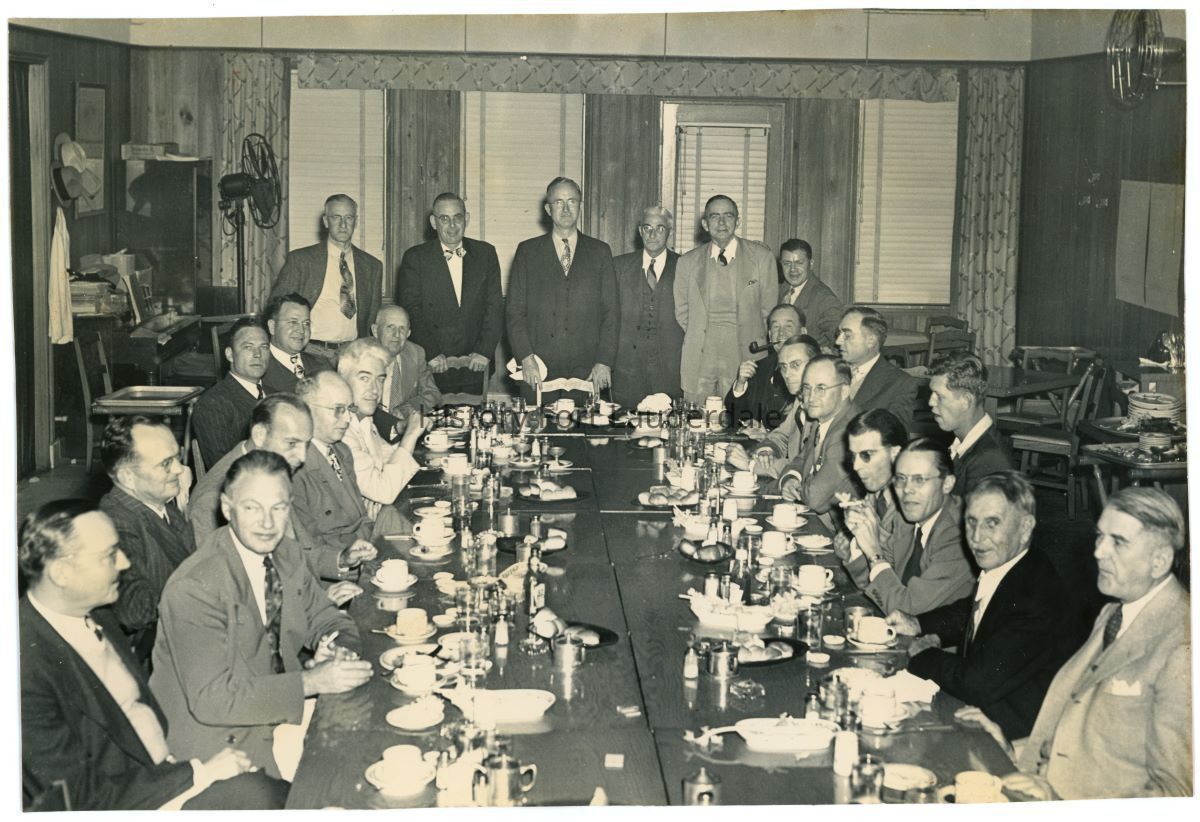August Jr. (seated third from bottom on left) at a meeting at Brown's Restaurant. Possibly a Rotary Club meeting?Collection