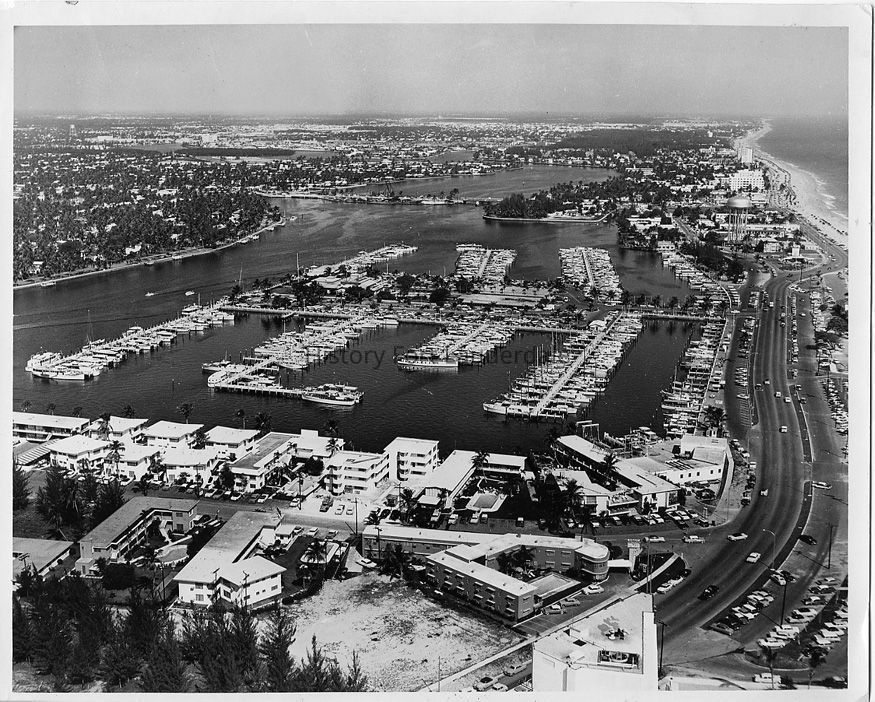 Aerial view of Bahia Mar looking north from the Yankee Clipper Hotel. A1A and beach to the right. Las Olas Causeway and Bridge in upper center. Lauderdale Beach Hotel in upper right.Collection