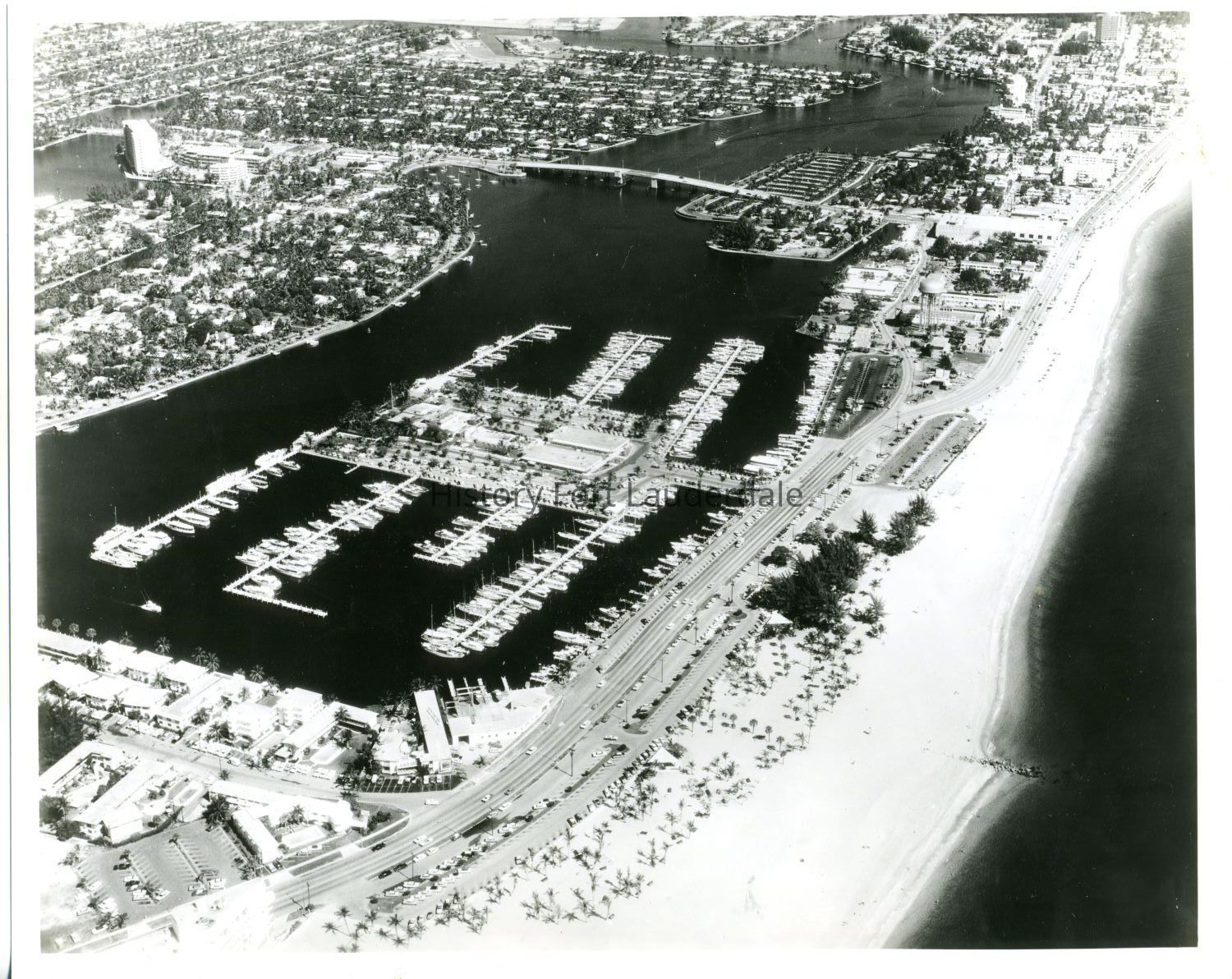 Aerial view of Bahia Mar looking northwest from the ocean. Yankee Clipper Hotel in the lower left. Las Olas Bridge in upper center.Collection