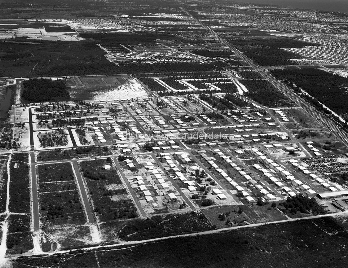 A close-up view of Kendall Lakes, west of Dixie Highway, looking NE. The Volkshaus dealership is show at the left center edge of the image. Pompano Estates is in the upper center of the photograph, west of Dixie Highway and Cresthaven is in the upper right quadrant of the image.Collection