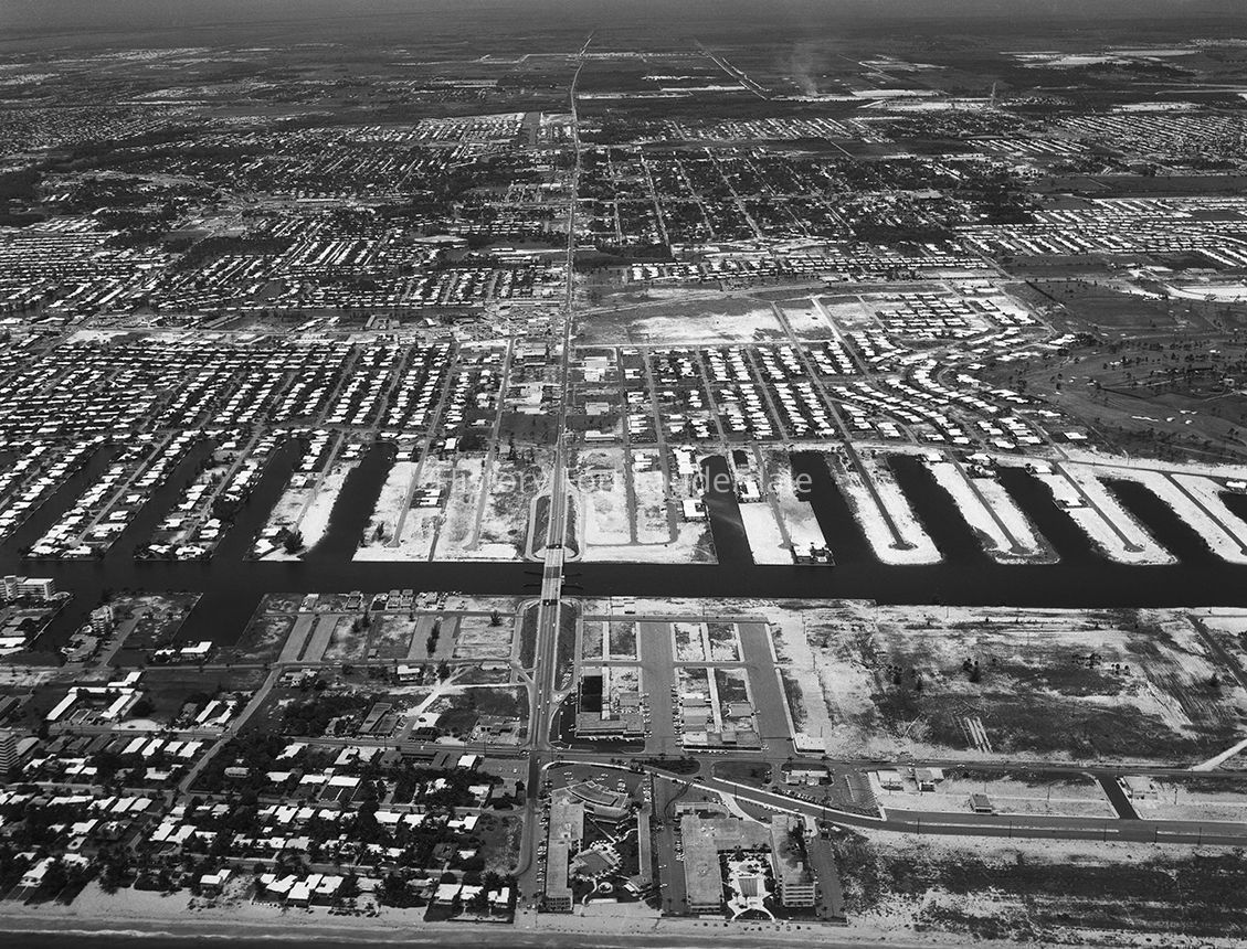 Looking W, Oakland Park Boulevardis centered (top of image to bottom); Galt Ocean Drive is to the right of the boulevard in the foreground; N Atlantic Boulevard (A1A) runs left to right on the barrier island. The Intracoastal Waterway, left to right, is in the middle ground and Bayshore Drive, on the mainland, run left to right in the mid section of the image. The southern portion of the Coral Ridge Country Club is shown in the left center edge of the photograph. The City of Oakland Park is in the background of the picture.Collection