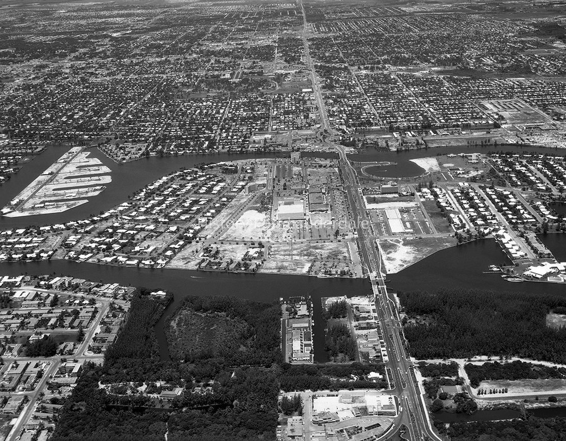 10th street. Looking West. Sunrise Blvd. (10th Street), which crosses the Intracoastal, is center left, running top to bottom in this image. Bonnet House (the Bartlett Estate) with the northern portion of Birch Estates is in the lower left foreground of the image. The Atlantic Beach and Seabreeze Developments are located to the right of the Bartlett property. Sunrise Bay and the Coral Ridge Yacht Club are to theleft side of the image, on the west side of the Intracoastal.Collection