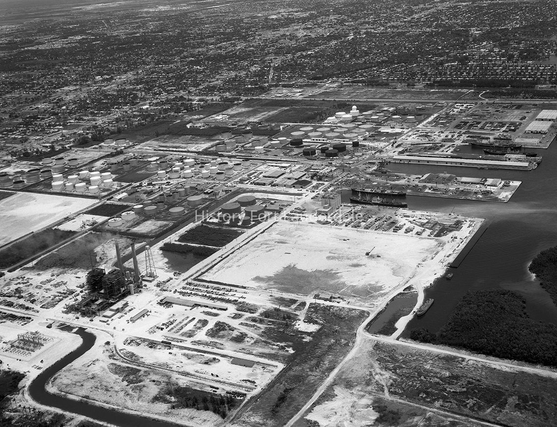 Port Everglades looking NW. A portion of the turning basin is shown at the right of the image. The piers are in the upper right quadrant; the tank farm is center and upper left. Tthe Florida Power and Light plant is in the lower left quadrant.Collection