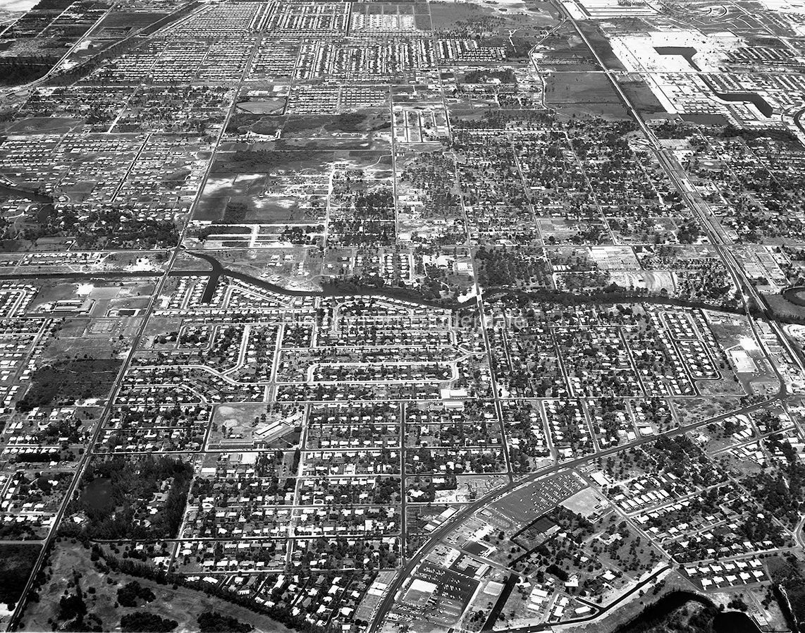 The image shows Wilton Manors from 4000'. Andrews Avenue runs (diagonally) south to north from the lower left corner. Oakland Park Boulevard runs east to west just above the center of the image. Wilton Manors Drive is in the lower right quadrant and the Richardson Golf Course is just visible in the lower left quadrant of the image. Sleepy River Acres is located north of Oakland Park and west of Andrews Avenue in the upper left quadrant.Collection