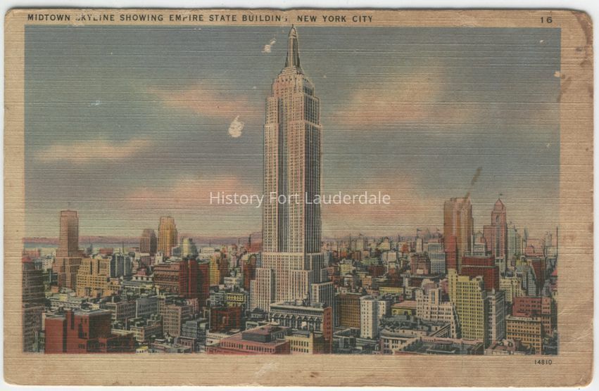 Colored image with border. Linen postcard. Postmarked 1945, New York, NY. Mailed to Mr. & Mrs. C. B. Haddix & Son, Fort Lauderdale, FL. One-cent green George Washington stamp.Collection