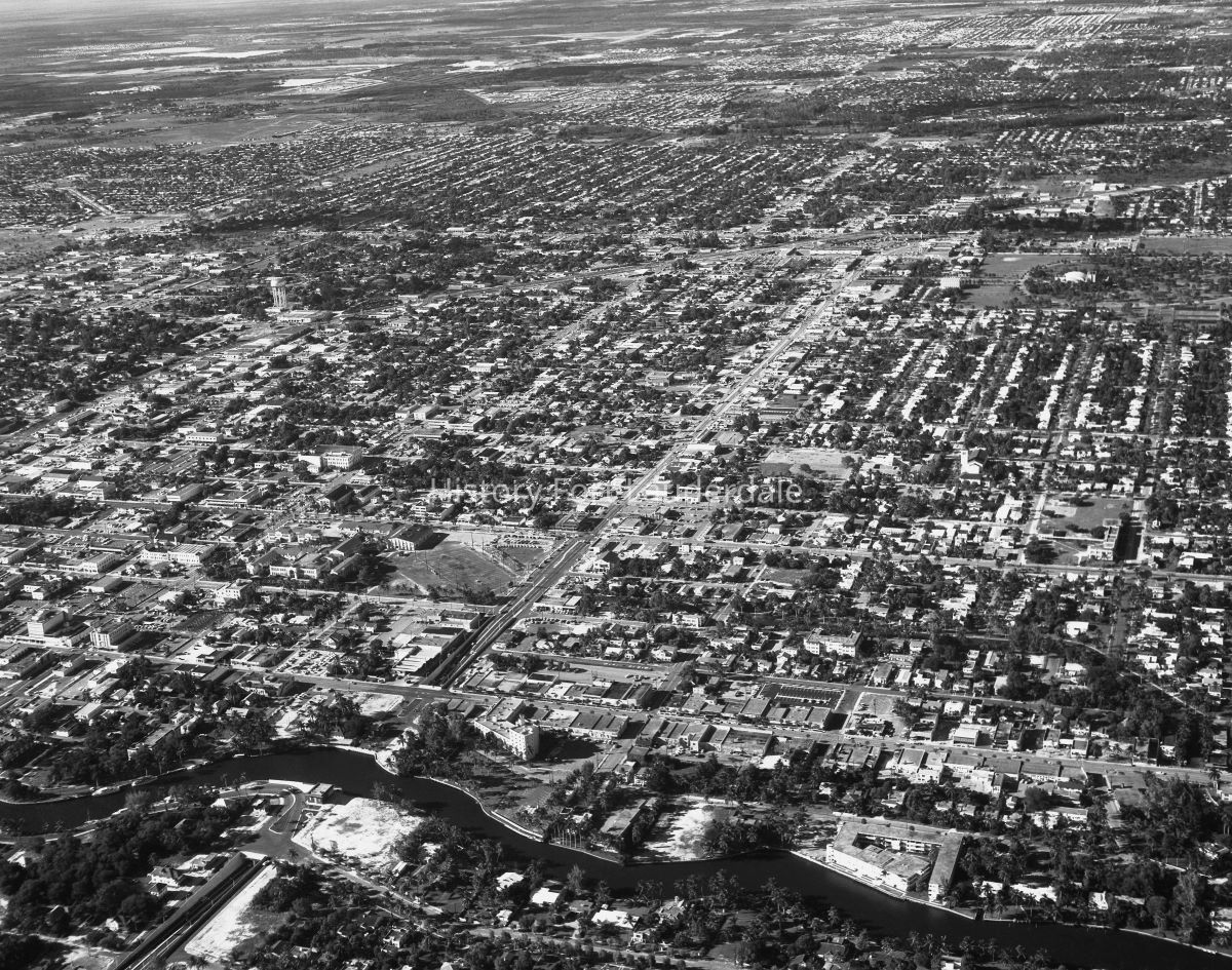 Aerial of Federal Highway and the New River Tunnel looking NNW in 1961. Fort Lauderdale High School located lower left center. Holiday Park upper right along the edge of the photograph.Photograph Details