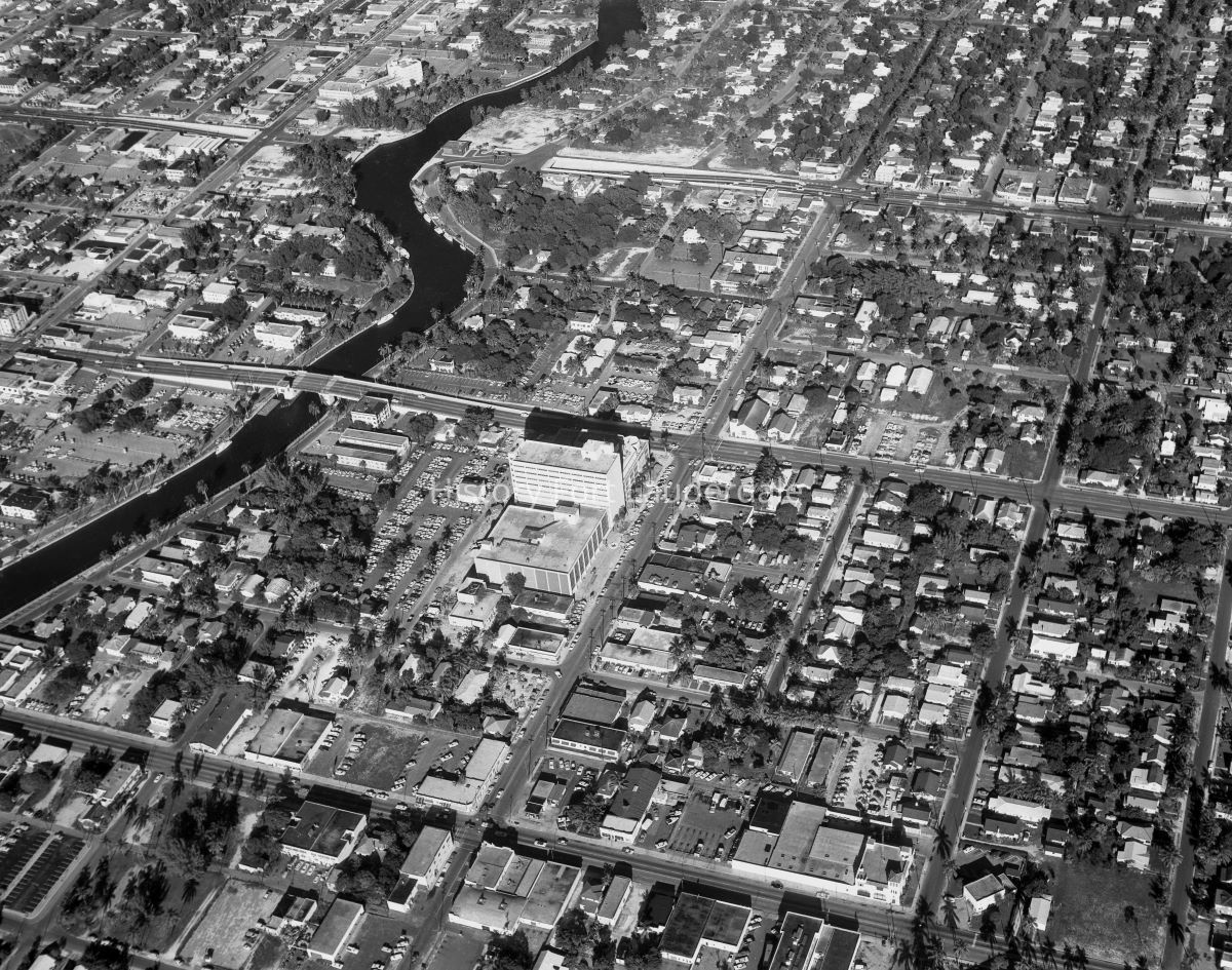 Aerial of 3rd Ave & SE 6 St looking east with Broward County Courthouse pictured center. New River on left, Andrews Ave., and Federal Highway pictured.Photograph Details