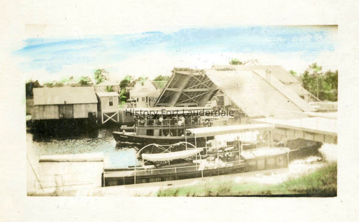 Andrews Ave. bridge in open position with a boat going through. Looking south and a fish house is in south side