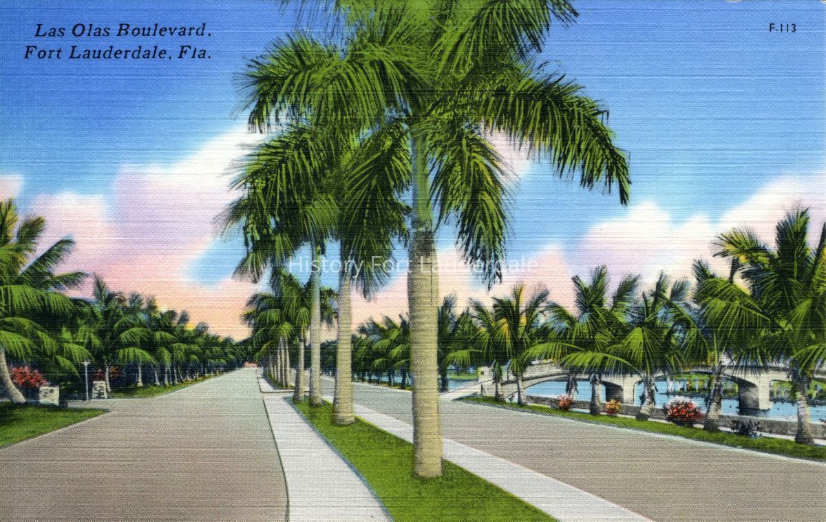 Las Olas Boulevard, Ft. Lauderdale, Fl. Las Olas Boulevard, a beautiful royal palm studded highway between Fort Lauderdale and Fort Lauderdale beach. It has many little bridges running from it to small islands where there are hundreds of small tropical homes. This picture shows one of these bridges