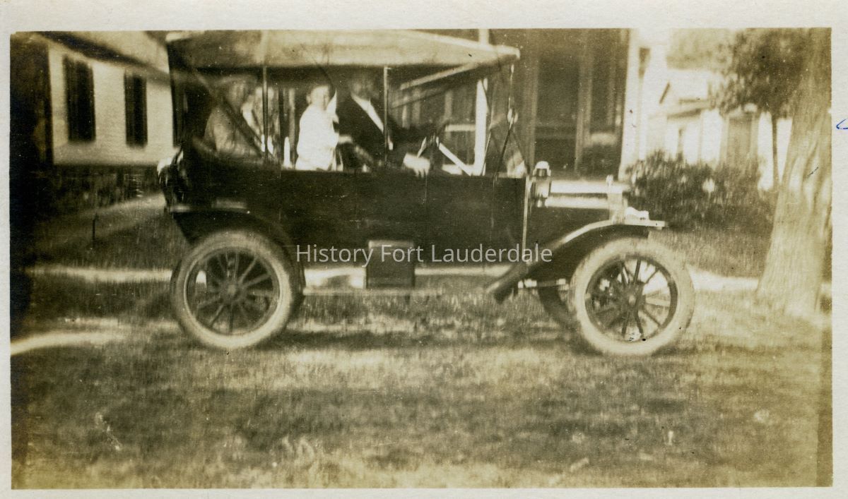 An unidentified man, woman and child in an old car.Entry/Object ID