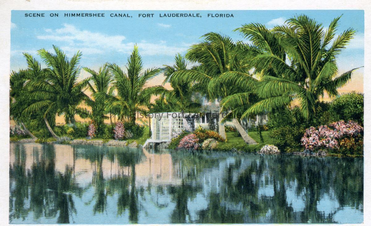 Scene on Himmarshee Canal, Ft. Lauderdale, Fl. Luyxuriant tropical foliage one hundred miles of waterways within the city. Splendid bathing beaches yachting, fishing, excursion trips, golfing incomparable at Fort Lauderdale