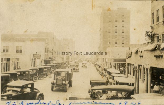 Downtown Fort Lauderdale after the Sept. 18, 1926 Hurricane, looking south on Andrews Ave. Bedding drying on hotel porch to the right