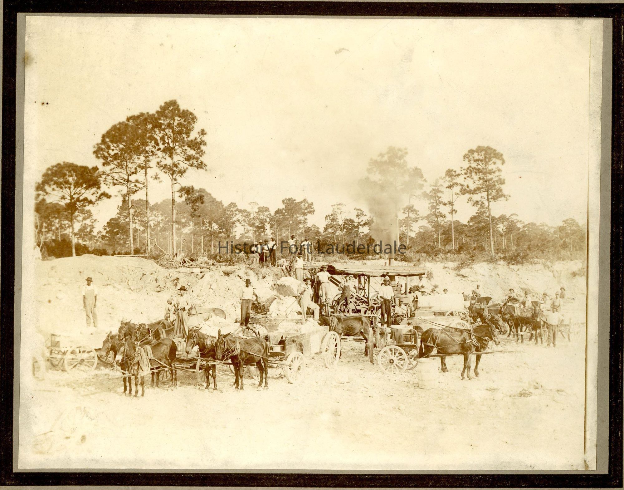 African-American work crew (~25) with horses and wagons surrounding steam shovel in the center. S.P. Snyder at the controls of the steam shovel. Mr. Pickings holding the reins on the wagon to the left of Mr. Snyder.Collection