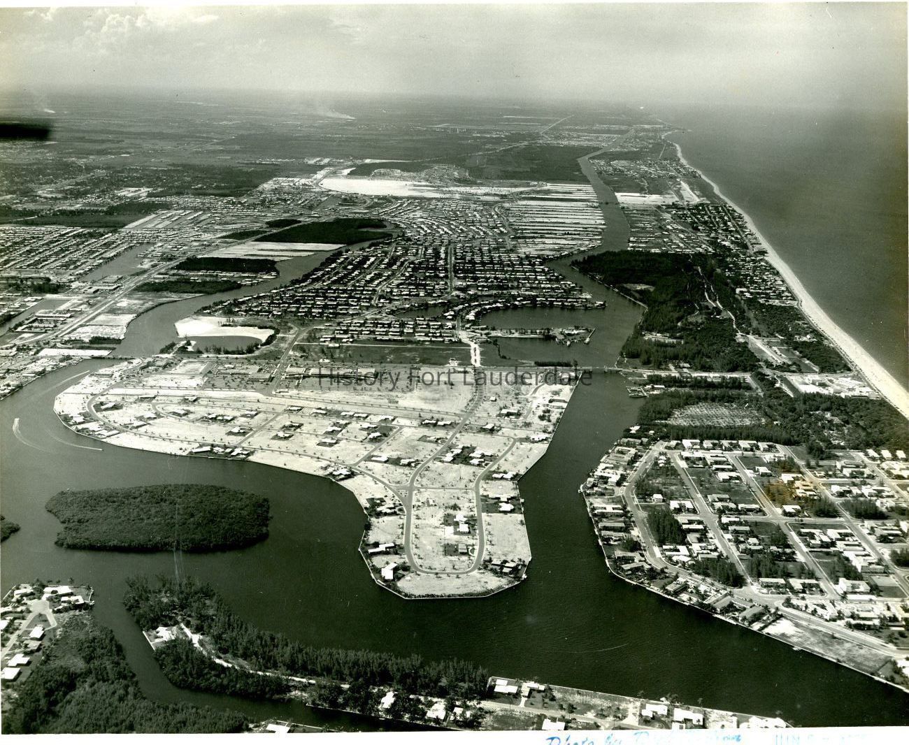 Aerial view looking north at the Sunrise Shopping Center and Sunrise Cay and Coral Ridge housing developments. Sunrise Boulevard runs left to right through center of the image.Collection