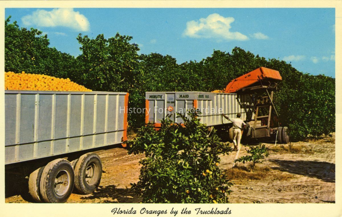 Florida oranges by the truckload. Oranges are loaded by most modern methods right within the large Florida Orange Groves. Name on truck is Minute Maid.