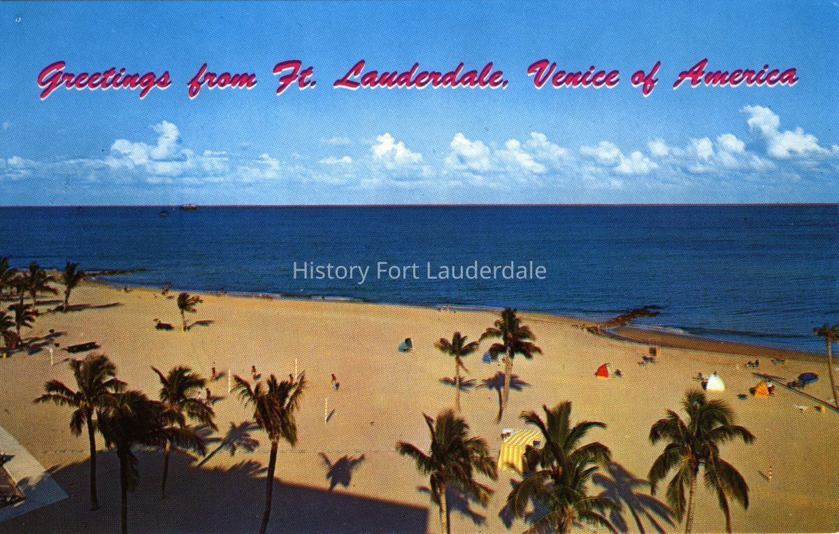 Greetings postcard. Ft. Lauderdale, Venice of America. Looking down from the top of the Yankee Clipper Hotel at Ft. Lauderdale, Florida's newest beach