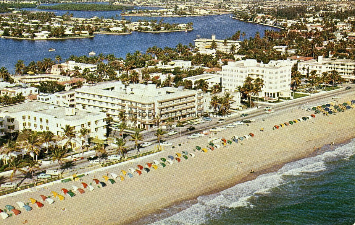 Airview of the beach with the hotel row in the background and Intracostal Waterway. Fort Lauderdale, Fl.