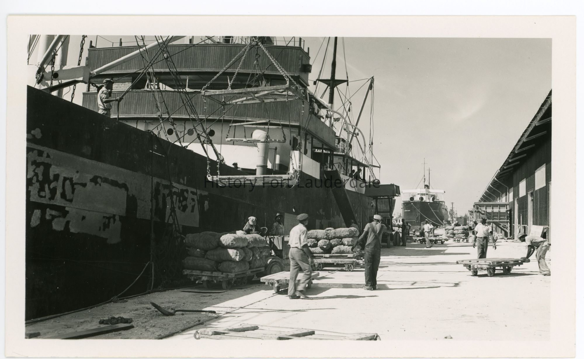 African American dock workers unloading freight ship at Port Everglades. Estrada Palma ferry in the background.Collection