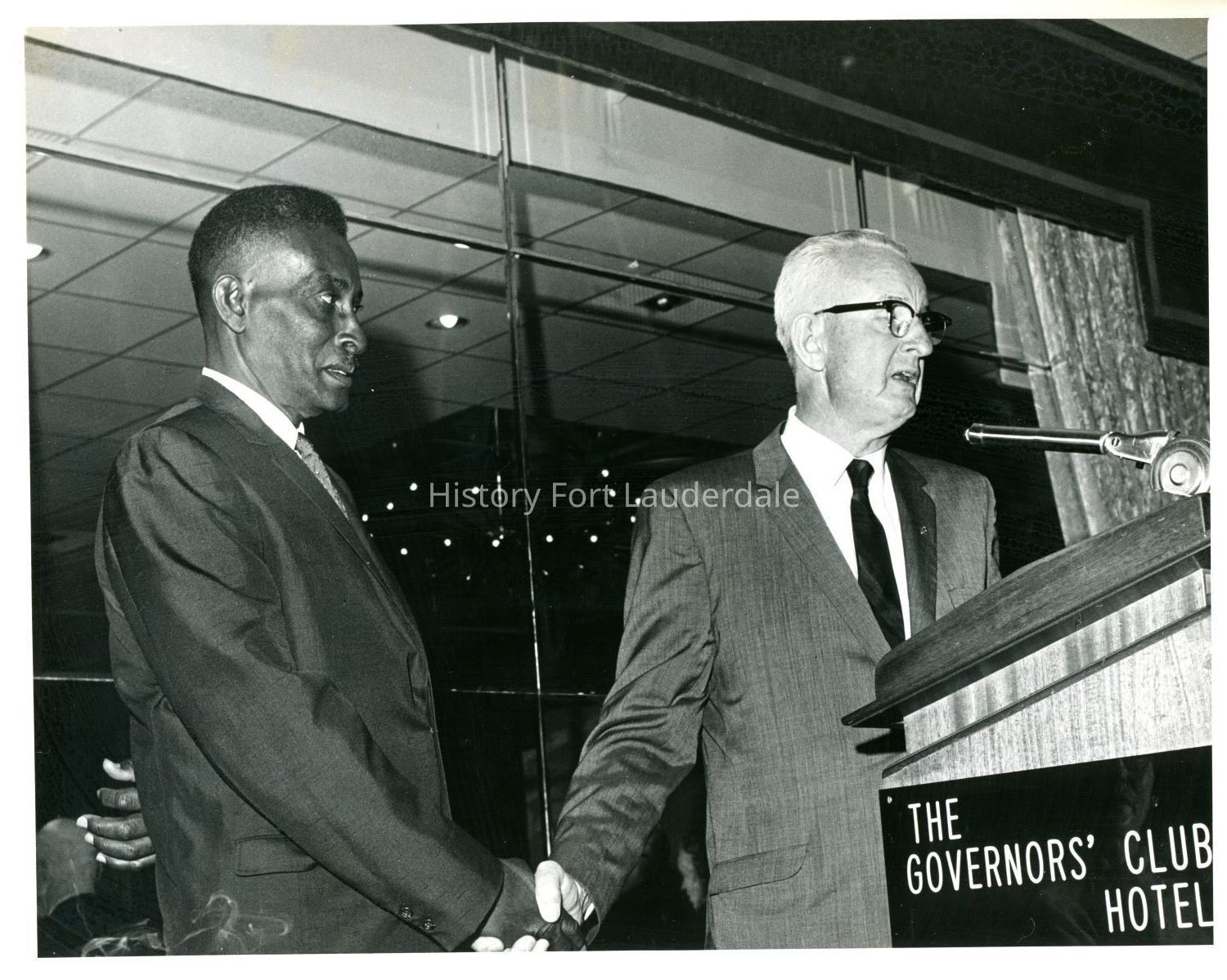 E. Thomas Wilburn at podium shaking the hand of Elliott McCoy, congratulating him for 25 years of service recognition from First Federal Savings & Loan. Event held at The Governors' Club Hotel.Collection