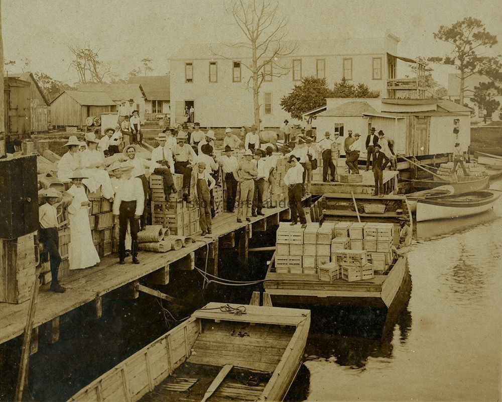 View of railroad shipping docks along the New River. Shipping vegetables from the New River. Stranahan store building in the background.