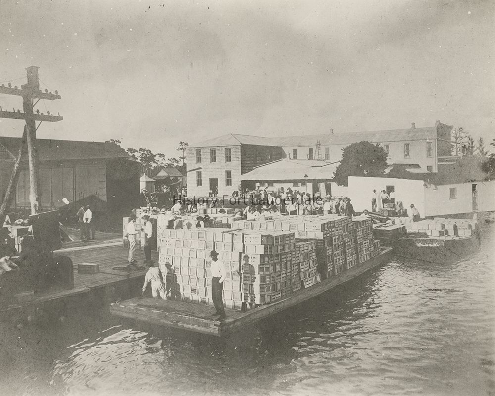 Barge loaded with crates docked at the FEC wharf. Railroad car and depot to the left. Stranahan store in the right background.