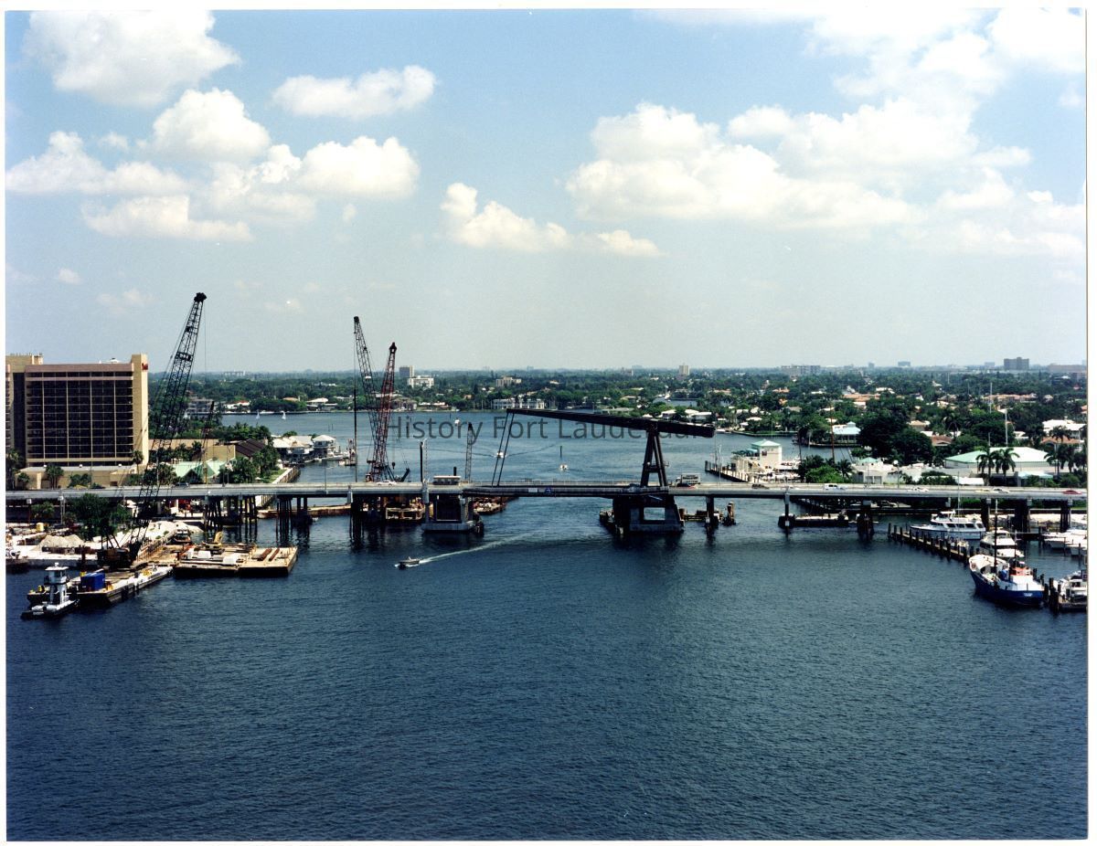 Looking north at the 17th Street Causeway bridge under construction in 1998. 15th St Fisheries on right, in between 2 cranes. Pier 66 Marina on left.Acquisition